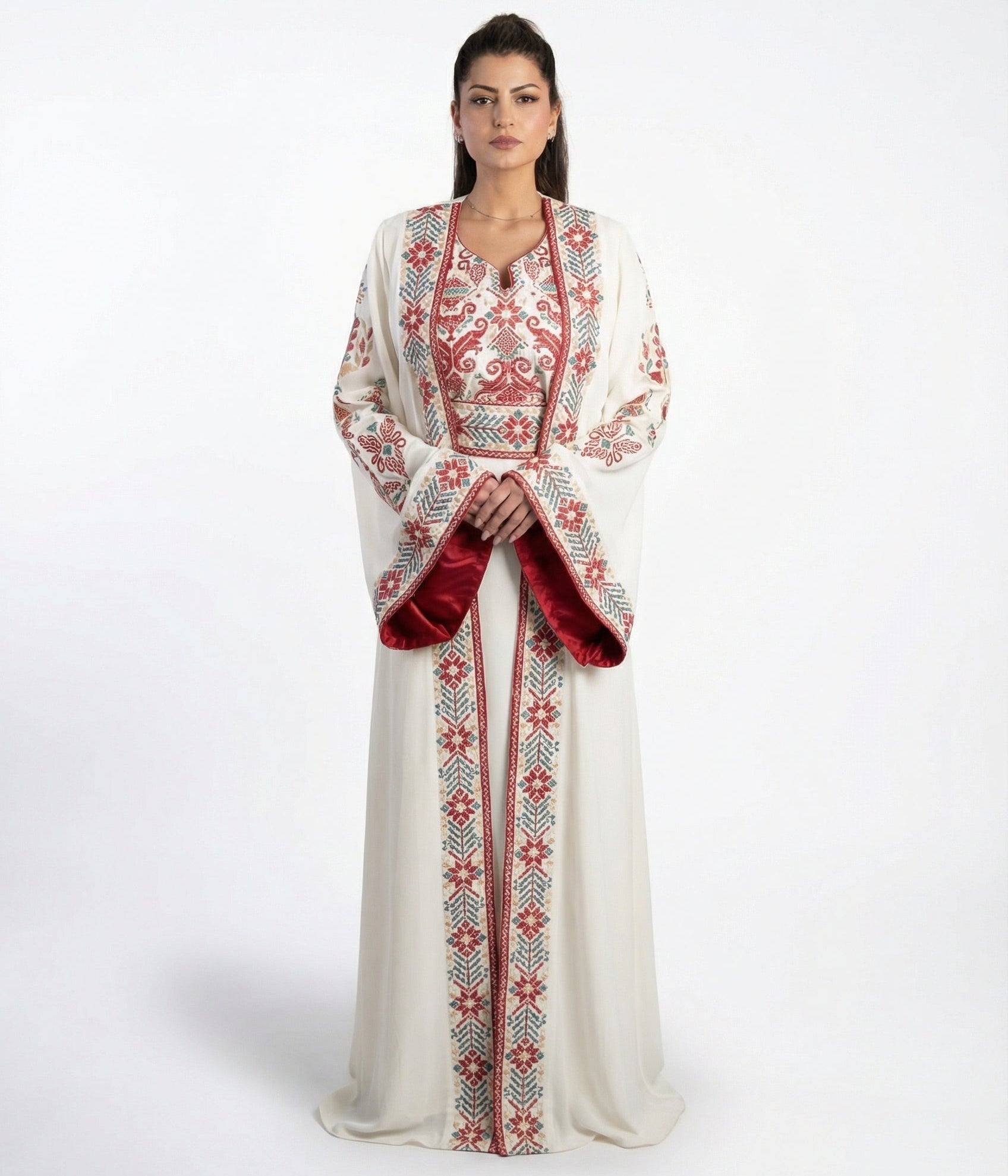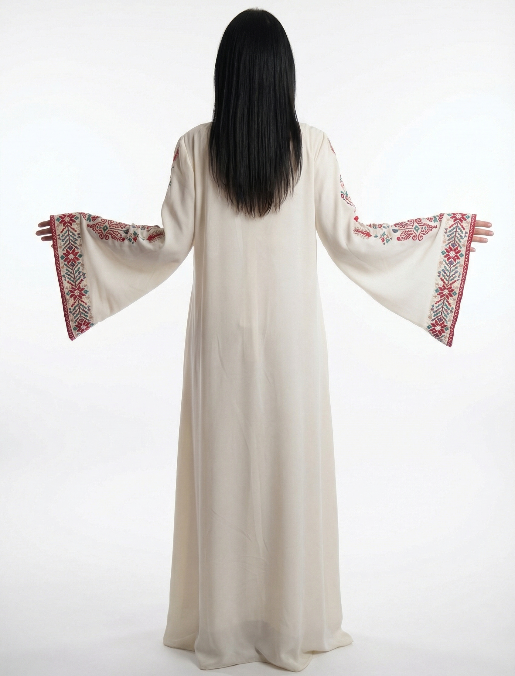 Stilvolle Abaya aus leichtem Georget. Der weiche Stoff fällt locker und sorgt für ein angenehmes Tragegefühl. Die helle Farbe wird durch traditionelle Muster in Rot und Grün geschmackvoll hervorgehoben und macht das Design zu einem besonderen Blickfang.